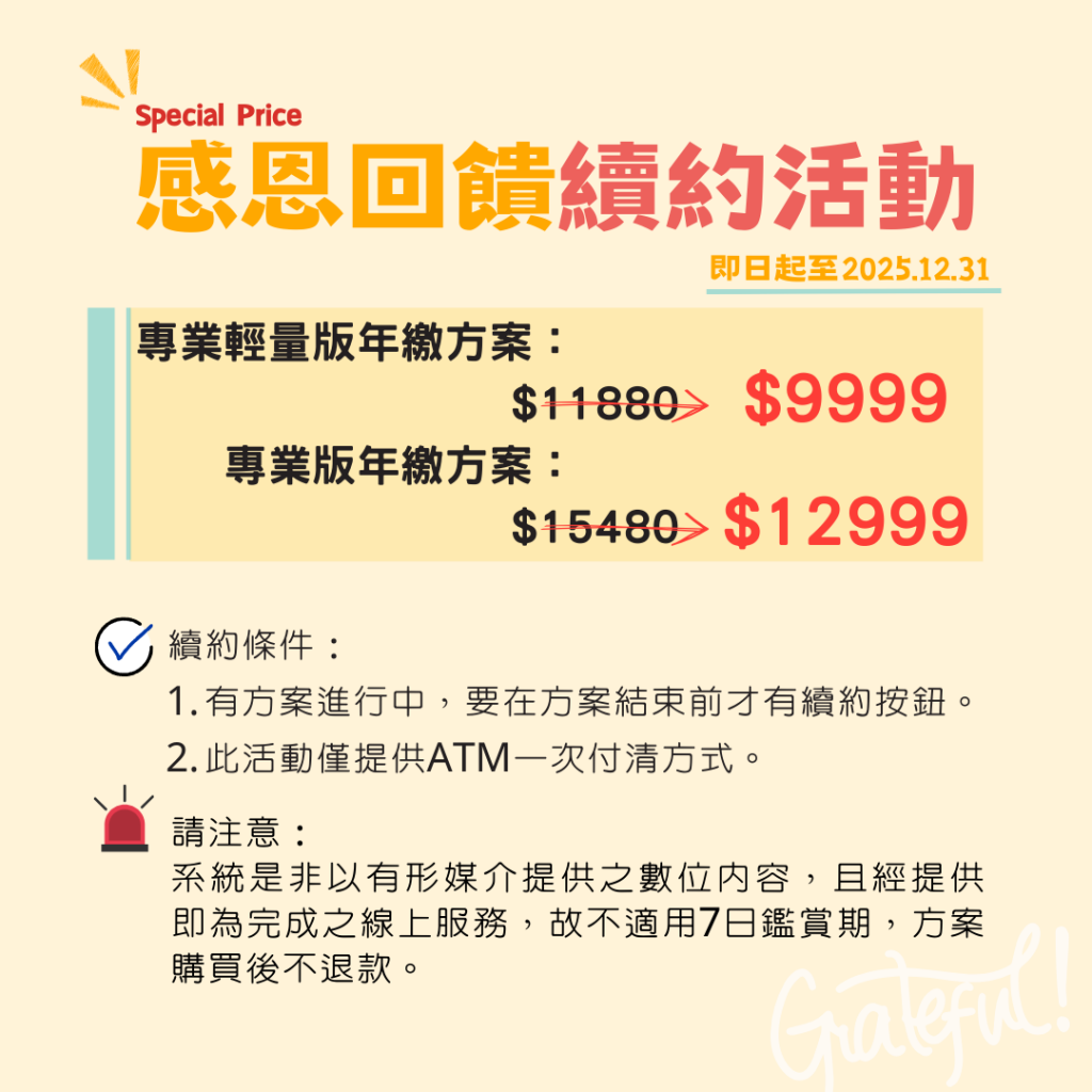 ⏰活動時間:試用方案或是ATM一次付清的季繳、年繳方案”進行中”,超過時間無法續約