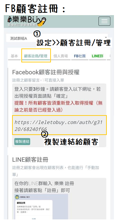 “後台➝設定/行銷➝基本設定➝顧客註冊/管理”,複製連結給顧客註冊